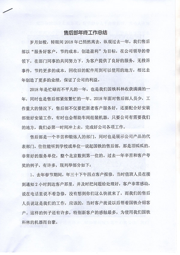 歲月如梭,轉(zhuǎn)眼間2018年已悄然離去,縱觀過(guò)去一年,我們售后部以“服務(wù)好客戶,節(jié)約成本,創(chuàng)造盈利”為目標(biāo),在公司領(lǐng)導(dǎo)的帶領(lǐng)下,在部門(mén)同事的共同努力下,為客戶提供了良好的服務(wù),無(wú)投訴事件,節(jié)約更多的成本,回收舊的配件用到可以使用的地方,相比去年創(chuàng)造了更多的業(yè)績(jī),保證了公司的利益。下面我將售后部對(duì)本年度的工作做以總結(jié):