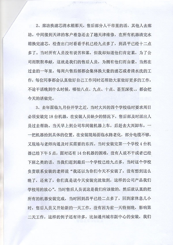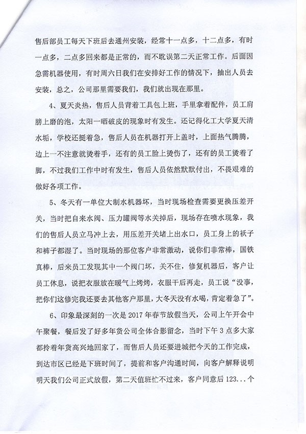 公司李秀田董事長(zhǎng)對(duì)售后部的工作總結(jié)給出高度贊賞,并做出回復(fù):你們的總結(jié)寫(xiě)的很好。你們真正做到了工作第一、客戶至上,樁樁事跡感人肺腑。你們用實(shí)際行動(dòng)詮釋了客戶的聲聲贊許,為公司帶來(lái)眾多的回頭客戶。望繼續(xù)努力,再創(chuàng)輝煌!向你們致敬!
