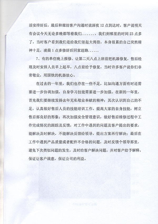 在新的一年里,首先我們要繼續(xù)發(fā)揚(yáng)去年無(wú)私敬業(yè)奉獻(xiàn)的精神;其次認(rèn)識(shí)到自己的不足,認(rèn)真做好售后人員的技能培訓(xùn)工作,提高大家的自身技能,樹(shù)立售后部良好的形象;再次加強(qiáng)安全管理意識(shí),做好售后維修過(guò)程中工作完成情況的跟蹤及反饋,對(duì)工作中遇到的問(wèn)題及客戶提出的要求,能解決及時(shí)解決,不能解決反饋給領(lǐng)導(dǎo),提出方案再行解決;最后在工作中遇到產(chǎn)品質(zhì)量或者配件不合格的問(wèn)題,及時(shí)反饋個(gè)領(lǐng)導(dǎo)那里,避免下次類(lèi)似問(wèn)題的發(fā)生,及時(shí)給客戶解決問(wèn)題,并對(duì)客戶給予解釋?zhuān)WC讓客戶滿意,保證公司的利益。